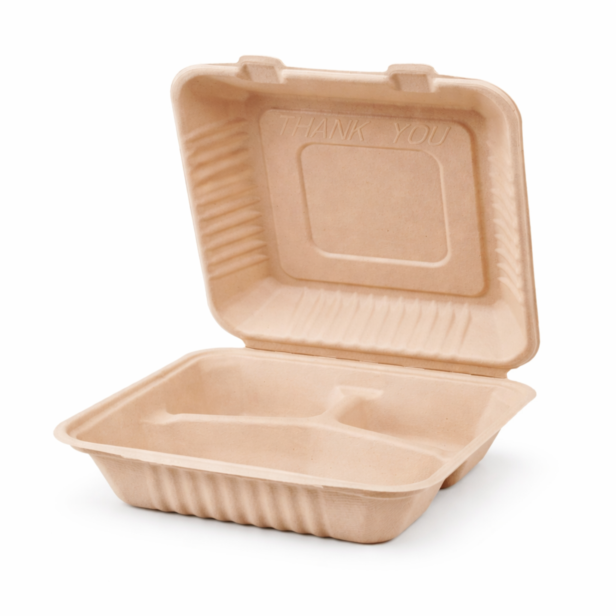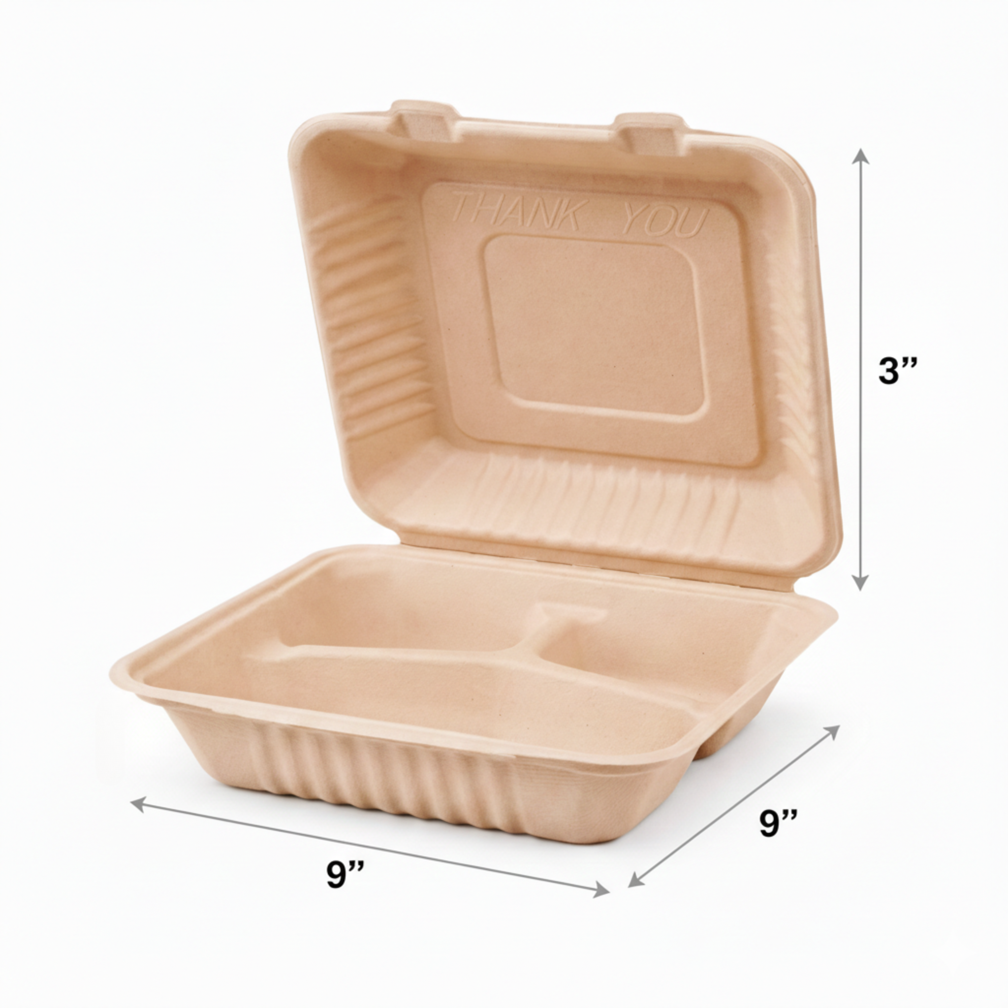 This 9" x 9" Bagasse Clamshell is the ultimate large, sustainable solution for serving organized meals, deli platters, and combo dishes. Made from 100% renewable sugarcane fiber (Bagasse), this container is typically PFAS-free and certified composable in commercial facilities. The crucial 3 Separate Compartments prevent entrees, sides, and sauces from mixing, maintaining the quality and flawless presentation of complex meals. Its sturdy, hinged construction and secure locking tab ensure food stays organized and contained during transport.